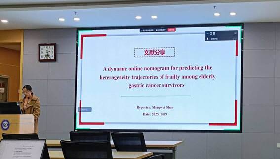 第二位汇报者是2024级博士研究生邵梦薇,汇报的文章题目是“A dynamic online nomogram for predicting the heterogeneity trajectories of frailty among elderly gastric cancer survivors”。2024年5月发表在International Journal of Nursing Studies期刊,影响因子为7.6分。近年来,胃癌因其高发病率和高死亡率,已成为威胁全球人类健康的重要恶性肿瘤之一。随着医学技术的不断进步,胃癌的手术适应证逐步拓宽,越来越多的老年患者获得手术治疗机会。然而,老年患者在术后康复过程中常出现衰弱相关症状,严重影响生活质量与康复效果。针对这一问题,该研究开展了对老年胃癌患者术后衰弱轨迹的系统研究,揭示了患者术后一年内的衰弱变化规律,并识别出不同的衰弱异质性轨迹类型。在此基础上,综合多项临床预测因子,构建了基于列线图的衰弱发展预测模型。列线图作为一种新型可视化预测工具,能够将复杂的风险评估结果以图形方式呈现,帮助临床医生直观评估患者的个体化风险,从而制定更为精准的干预策略。该模型通过受试者工作特征曲线(Receiver Operating Characteristic curve, ROC)、校准曲线及决策曲线分析(Decision Curve Analysis, DCA)验证,显示出良好的鉴别力、校准性和临床实用价值。该研究的开展为老年胃癌患者的术后管理提供了新的科研依据,也为实现精准医疗与智慧护理提供了有力支撑。