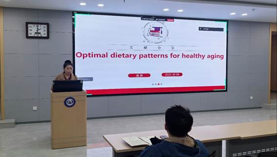 第一位汇报者是2024级博士研究生盛源,汇报的文章题目是“Optimal dietary patterns for healthy aging”。2025年3月发表在nature medicine期刊,影响因子为50.0分。该研究基于护士健康研究(Nurses' Health Study, NHS)和健康专业人士随访研究(Health Professionals Follow-up Study ,HPFS)两大队列,对超过10.5万名参与者进行了长达30年的随访,旨在探讨中年时期长期坚持八种健康饮食模式与健康老龄化之间的关联。研究将健康老龄化定义为活到70岁、无11种主要慢性病且认知、身体和心理功能完好。研究发现,对所有健康饮食模式的更高依从性均与更高的健康老龄化几率相关。其中,替代性健康饮食指数(Alternative Healthy Eating Index, AHEI)的关联性最强,而健康植物性饮食指数(healthful plant-based diet, hPDI)最弱。此外,超加工食品摄入量越高,健康老龄化的可能性降低32%。该研究结论表明,以植物性食物为主、富含果蔬、全谷物和不饱和脂肪,并限制红肉、加工肉类和钠盐摄入的饮食模式,对促进整体健康老龄化至关重要。