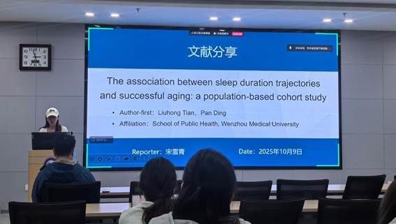 第三位汇报者是2024级博士研究生宋雪青,汇报的文章题目是“The association between sleep duration trajectories and successful aging: a population-based cohort study”。2024年11月发表在BMC Public Health期刊,影响因子为4.2分。成功老龄化是指个体在老年阶段,生理功能维持良好,认知功能保持敏锐,心理健康状态积极,并能积极参与社会生活。该研究使用来自中国健康与养老追踪调查的数据,严格按照纳排除标准对参与者进行筛选,旨在探讨睡眠时间轨迹与成功老龄化的关系。使用潜在类别混合模型进行睡眠时间的轨迹拟合,最终得到5个睡眠时间轨迹,分别为长稳定轨迹组、下降轨迹组、正常稳定组、上升轨迹组和短稳定轨迹组。使用逻辑回归分析5个睡眠时间轨迹组与成功老龄化的关系,结果发现,与睡眠时间正常稳定轨迹组相比,睡眠时间上升轨迹组和睡眠时间短稳定轨迹组的参与者成功老龄化率显著下降。汇报者指出,这项研究的研究结果表明了对睡眠时间进行动态监测的重要性,睡眠时间和睡眠质量将有可能成为影响实现成功老龄化的关键指标。