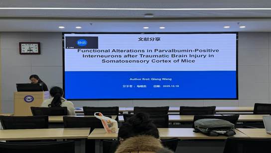 第一位汇报者是2024级硕士研究生马明杰,分享的文章题目是“Functional Alterations in Parvalbumin-Positive Interneurons after Traumatic Brain Injury in Somatosensory Cortex of Mice”。2025年8月发表于The Journal of Neuroscience期刊,影响因子是4.0分。研究聚焦创伤性脑损伤(Traumatic Brain Injury,TBI)后皮层网络的功能紊乱,以维持抑制平衡的核心细胞群——PV阳性篮状细胞(Parvalbumin-Positive Basket Cells,PV-BCs)为研究对象,探究其在损伤后早期(24小时)的数量变化与电生理重塑机制。结果显示,TBI后24小时,皮层PV-BCs数量减少但形态未见明显改变,同时表现出一种矛盾状态:这类细胞更容易被激活,却难以维持高频放电。进一步研究发现,HCN离子通道在正常情况下主要分布于轴突,是维持高频放电的关键;损伤后,该通道向胞体迁移,导致轴突电生理稳定性下降,尽管细胞整体HCN电流增强,却削弱了其高频放电的稳定性。药理学与计算模拟结果显示,HCN通道定位的改变,本质上削弱了PV-BCs对神经网络的高频抑制功能。汇报者指出,该研究提示在TBI后极早期采取干预抑制系统的此类重构,或将成为预防后期脑网络功能紊乱的新策略。