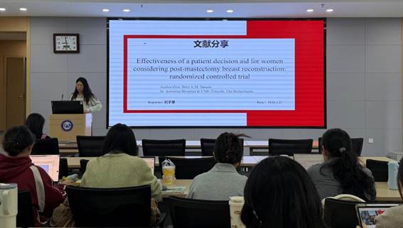 第二位汇报者是2024级硕士研究生刘子豪,分享的文章题目是“Effectiveness of a patient decision aid for women considering post-mastectomy breast reconstruction: randomized controlled trial”。2025年8月发表在British Journal of Surgery期刊,影响因子为5.8分。研究为在荷兰某社区教学医院开展的单中心随机对照试验,共纳入134名患者,并以1:1比例分为干预组与对照组。其中干预组采用标准护理联合在线决策辅助工具(PMBR-Specific Patient Decision Aid, pDA),对照组则由多学科团队提供标准化护理。研究分别在基线、决策完成后及术后1年进行数据采集,以决策冲突量表(Decisional Conflict Scale, DCS)为主要结局指标,同时对决策参与度、患者报告结局等次要指标进行评估。结果显示,两组患者基线特征无统计学差异,干预组pDA完成率达100%,决策后及术后1年随访应答率分别为90%和87%。主要结局方面,干预组DCS均值得分为17分,对照组为20分,组间差异无统计学意义,且两组均处于低决策冲突水平。次要结局方面,两组在决策参与度、心理生理健康状况、手术路径变更等方面亦无显著差异。研究分析认为,上述结果与所在机构护理基础质量较高有关,决策辅助工具未体现出额外获益,这一结论也与同类高质量护理背景下的相关研究结果相一致。汇报者指出,研究最终表明,在高质量多学科护理模式下,乳房重建相关在线决策辅助工具相较于标准护理未显现额外增益,两种方式均可有效支持患者临床决策,提示决策辅助工具的应用效果依赖于现有护理服务的完善程度。