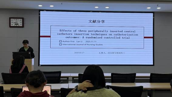 第一位汇报者是2024级硕士研究生胡肖兰,分享的文章题目是“Effects of three peripherally inserted central catheters insertion techniques on catheterization outcomes: A randomized controlled trial”,2025年11月发表在International Journal of Nursing Studies期刊,影响因子为7.1分。研究采用随机对照试验设计,系统对比了传统非隧道式、单针皮下隧道式、双针皮下隧道式三种经外周静脉置入中心静脉导管(Peripherally Inserted Central Catheter, PICC)置管技术的临床应用效果。结果表明,单针与双针皮下隧道式置管技术在一次性穿刺成功率、穿刺后24小时渗血率方面均优于传统非隧道式;其中单针式置管技术在术中出血量、患者疼痛程度及操作时长等指标上,显著优于双针式技术,且三种置管方式均未发生血管神经损伤相关不良事件。汇报者指出,该研究结果表明,单针式皮下隧道置管技术兼具较高的穿刺成功率与优良的患者就医体验,为临床PICC置管技术的优化选择提供了循证依据,同时也为护理人员提升超声引导下徒手操作能力、保障置管安全、持续优化静脉治疗护理质量提供了重要参考。