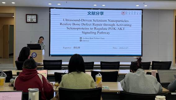 第三位汇报者是2024级硕士研究生查贻荣,分享的文章题目是“Ultrasound-Driven Selenium Nanoparticles Realize Bone Defect Repair through Activating Selenoproteins to Regulate PI3K/AKT Signaling Pathway”。2025年3月发表于ACS Nano期刊,影响因子为16.0分。该研究围绕骨缺损修复中异常炎症反应这一关键制约因素,构建了超声响应型复合水凝胶系统LNT‑SeNPs@Gel。该体系由明胶-甲基丙烯酰与香菇多糖修饰的硒纳米颗粒复合而成,具备优异的抗氧化与抗炎性能,可有效重塑骨缺损区域的炎症微环境。该水凝胶可实现超声催化与超声修复双重功能,通过级联协同治疗模式,有效提升治疗效率并缩短修复周期。在骨修复炎症阶段,超声催化作用可远程调控LNT‑SeNPs@Gel水凝胶中硒纳米颗粒的精准释放,抑制活性氧与炎症因子的过量产生,进而改善局部炎症微环境。在此基础上,超声修复作用进一步激活硒蛋白介导的PI3K/AKT信号通路,促进MC3T3‑E1细胞成骨分化,最终实现骨缺损的高效修复。