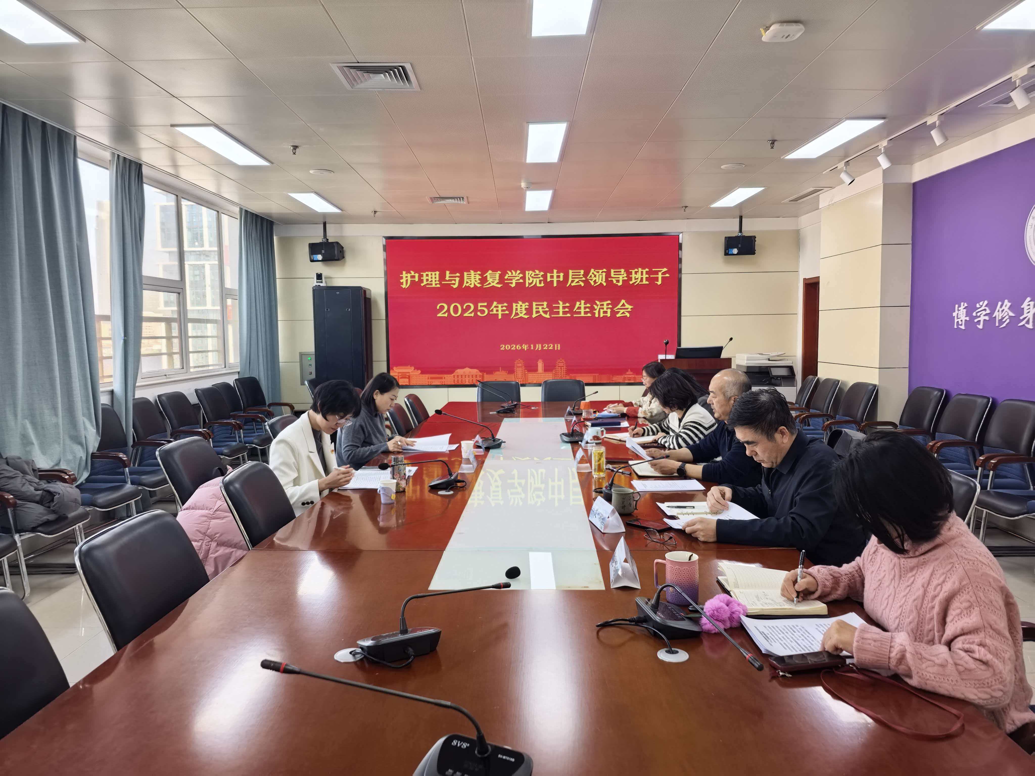 2026年1月22日下午,护理与康复学院召开2025年度中层领导班子民主生活会,学校第五督导组李永卫、明立彩同志到会指导,学院党委书记王晓林主持会议,班子党员成员参加会议,班子非党员成员列席会议。
