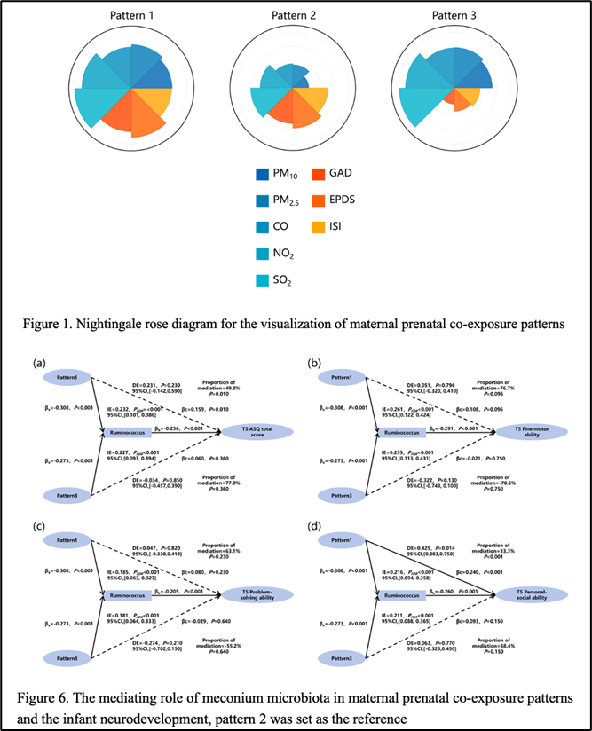 该研究基于课题组前瞻性队列中的309对母婴数据,整合暴露组学与微生物组学,深度解析了产前空气污染与心理困扰联合暴露对新生儿胎粪菌群的影响及其在早期神经发育中的关键作用。借助自组织图(SOM),研究精准识别出三种产前空气污染-心理困扰联合暴露模式;通过微生物组多变量关联分析(MaAsLin 2),筛选出11个差异菌属;KEGG通路分析进一步揭示,不同暴露模式下的胎粪菌群代谢特征。最后通过中介分析发现,瘤胃球菌属在“应激-微生物-脑轴”发育编程中发挥核心介导作用。该成果不仅为揭示生命早期肠道菌群定植的母体调控机制提供了关键证据,也为将婴儿肠道微生物纳入环境污染与心理困扰联合暴露的风险评估框架奠定了科学基础。