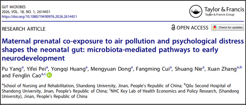 近日,山东大学护理与康复学院曹枫林教授团队以“Maternal prenatal co-exposure to air pollution and psychological distress shapes the neonatal gut: microbiota-mediated pathways to early neurodevelopment”为题在Gut Microbes(中科院一区top期刊,5年IF=13.4)上发表论文。曹枫林教授与张烜副研究员为共同通讯作者,博士研究生杨谱为第一作者,山东大学护理与康复学院为第一和通讯作者单位。
