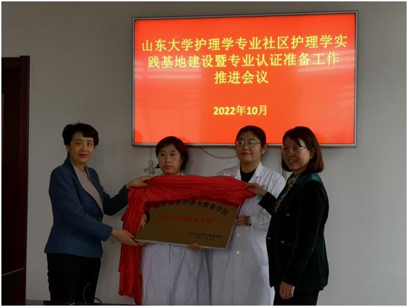 会上,济南市第四人民医院任兴业院长首先介绍了北村社区卫生服务中心的基本情况,并强调要求社区卫生服务中心要继续发扬优良传统、坚守为民初心,努力做好护理学专业认证准备,以评促建,以评促改,提高社区护理学实践教学工作质量。山东大学护理与康复学院王克芳院长对济南市第四人民医院长期以来给予山东大学护理学专业建设的高度重视与支持表示感谢,特别是北村社区卫生服务中心对学院的本科生实践教学工作的大力支持给予了高度评价。随后,进行了山东大学护理与康复学院社区护理学实践教学基地挂牌仪式。山东大学护理与康复学院李静副院长对专业认证工作做了具体说明,济南市第四人民医院社区管理部杨华主任做了护理实习教学工作及专业认证准备工作汇报。学院与社区的老师们就社区护理实践教学和护理学专业认证的相关考察要求进行了热烈讨论,并现场参观了社区的康复服务设施。
