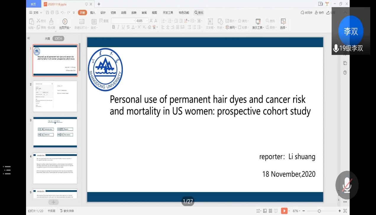 本次论坛第一位汇报者2019级硕士研究生李双,汇报的题目为《Personal use of permanent hair dyes and cancer risk and mortality in US women: prospective cohort study》。本研究为大型前瞻性队列研究,对117200女护士进行随访36年,调查研究对象使用持久染发剂的持续时间、使用频率、累计剂量、首次使用年龄或首次使用后的时间与癌症及相关死亡的关联。通过数据分析发现,共有20805名女护士确诊为实体恶性肿瘤,1807例血液癌症,22560例基底细胞上皮瘤,以及2792例皮肤鳞状细胞癌。此外,累计有4860名癌症相关死亡。基底细胞癌的风险略有增加,而脑癌和慢性淋巴细胞白血病或小淋巴细胞淋巴瘤的风险在曾经使用过的患者中风险较低。在剂量依赖性分析中,并且发现累积剂量越大,总体乳腺癌的风险越高,具体表现是雌激素受体阴性乳腺癌、孕激素受体阴性乳腺癌、性激素受体阴性乳腺癌的风险更高,与受体阳性亚型乳腺癌明显缺乏关联。卵巢癌风险与剂量呈正相关,患慢性淋巴细胞白血病或小淋巴细胞淋巴瘤的风险较低。永久染发剂的使用与癌症相关死亡之间没有显著关联研究。由于该研究是在美国女护士群体中开展的,研究结果还需要进一步的证实。因此不能直接推及到其他国家的人群。