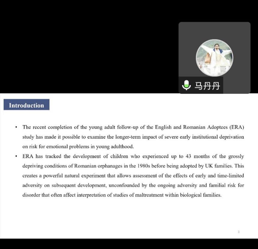 第一位汇报者是2021级硕士研究生马丹丹,汇报的是Journal of Child Psychology and Psychiatry杂志期刊上题为“Why does early childhood deprivation increase the risk for depression and anxiety in adulthood? A developmental cascade model”。本研究结合发展级联模型和McCory学者最近重新阐述的一个观点(暴露于早期逆境,可以增加儿童对于压力的脆弱性,并且可能至生命晚期才出现障碍),利用收养/寄养前机构剥夺这一条件作为早期逆境展开探讨(剥夺→6岁神经认知发展→19-23岁的爱情、友情功能和失业情况→23岁情绪问题症状,其中控制了性别、15岁时情绪问题症状、SES),该研究提示了应注重各种因素间的发展级联相关,以揭示影响个体发展的各种因素的错综复杂关系,对于童年早期处于长期逆境的儿童,在过渡到成人早期时应注意其情绪问题的发生,可及时提供心理辅导、社会技能训练和就业指导等。但本研究存在一些问题:用ADHA、ASD、DSE来代表儿童神经认知发展,路径分析中如何控制15岁时的情绪问题和SES等。