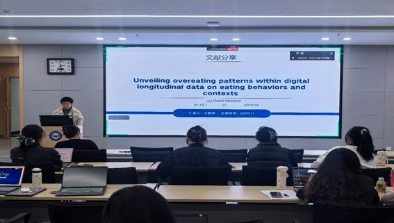 第一位汇报者为2024级硕士研究生王雅琦,汇报的文章题目是“Unveiling overeating patterns within digital longitudinal data on eating behaviors and contexts”,2025年9月发表在NPJ Digital Medicine期刊,影响因子为15.1分。该研究通过可穿戴摄像头和移动应用程序进行生态瞬时评估,并借助营养师管理的24小时饮食回顾方法,收集了65名处于自由生活环境中肥胖个体的膳食信息;通过监督学习预测暴饮暴食发作,并使用半监督学习确定了五种不同的暴饮暴食表型。这些结果强调与暴饮暴食相关的行为、心理和背景各因素之间的复杂相互作用,为个性化干预提供了基础。汇报者指出,该研究综合多模态信息来源,同时收集主客观信息,并使用严谨的机器学习方法进行数据分析,而且为解决肥胖人群暴食问题提供了新的思路和方法,值得参考学习。