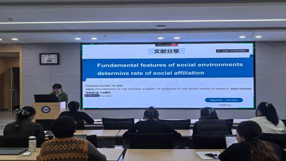 第三位汇报者是2024级硕士研究生郭利娜,汇报的文章题目是“Fundamental features of social environments determine rate of social affiliation”。2025年10月发表在PROCEEDINGS OF THE NATIONAL ACADEMY OF SCIENCES OF THE UNITED STATES OF AMERICA期刊,影响因子为9.1分。该研究旨在探索社会联结决策是否以及具体如何取决于社交环境的基本特征,采用了一种新颖的社交联结寻求范式(“交友请求任务”),结果显示,随着交友机会密度的降低和成功频率的增加,人们更有可能发送交友请求,且这一效应模式与动物觅食行为高度相似;其次,心理健康维度中的“社会繁荣”和“愉悦感”(即低快感缺乏状态)与任务中的交友请求行为(如总发送请求次数)显著相关,即高愉悦感的个体更能根据环境友好度灵活调整自身社交策略;最后,基于神经机制探讨的结果表明,社交环境的机会密度和交友成功率会影响一组与觅食行为相关的脑区网络(包括背缝核、黑质、前岛叶等)的神经活动,这些皮质-皮质下环路介导了环境统计特征对社交决策的影响。该研究表明,社交决策并非完全由个人特质决定,而是会依据环境的“背景统计特征”进行主动调整,构建更加和谐的社会能为人们的社交生活和整体福祉带来积极影响;同时,社交功能的异常可能是心理健康问题的表现或诱因,未来可从“改善社交环境感知-调节社交行为-促进心理健康”的路径开展干预研究;再者,对神经机制的探索也加深了对“社交联结是人类基本需求”的理解。汇报者指出,此研究成果为社交行为研究开拓了新方向,后续可结合神经机制研究推动社交与心理领域实践发展。