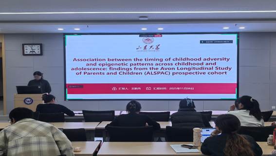 第二位汇报者是2024级硕士研究生王朝冉,汇报的文章题目是“Association between the timing of childhood adversity and epigenetic patterns across childhood and adolescence: findings from the Avon Longitudinal Study of Parents and Children (ALSPAC) prospective cohort”。2023年6月发表在The Lancet Child & Adolescent Health期刊,影响因子为15.5分。该研究基于ALSPAC前瞻性队列,纳入609-665名儿童,采用结构化生命历程建模,探究出生至11岁的7类童年逆境与出生、7岁、15岁DNA甲基化的关联。该研究采用Raine Study and Future of Families和Child Wellbeing Study两个独立队列研究对研究结果进行外部验证。结果显示,41个CpG位点与逆境存在关联(逆境可解释≥3.5%甲基化变异),其中有35个位点(占比85%)与3-5岁逆境暴露显著相关。“单亲家庭”关联位点(20个)占比最大,且效应仅在青春期显现,11个位点在独立队列中验证一致。同时,识别出了6种甲基化发育轨迹,多数甲基化差异支持“潜伏性轨迹”,即发育早期并未有显著的DNA差异,直至15岁时才显现。此外,延续先前研究,发现7岁时的关联位点未持续至青春期。研究证明了童年逆境与甲基化的关联存在时期特异性和动态性,为3-5岁逆境暴露儿童的早期干预及青春期健康风险筛查提供了依据。该文章表明,在进行逆境-DNA甲基化关联研究时考虑逆境发生的时期至关重要;此外,逆境对表观遗传的改变可能早期以“细微失同步”形式存在,随发育进程逐渐累积,最终在青春期、成年期通过疾病表现出来;表观遗传关联并非一经形成就稳定不变,而是随发育进程动态变化。汇报者指出,这项基于ALSPAC前瞻性队列的研究为深入理解童年逆境与DNA甲基化之间的复杂关系提供了全新的视角。