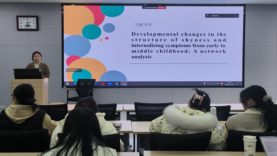第一位汇报者是2024级硕士研究生杨灵慧,分享的文章题目是“Developmental changes in the structure of shyness and internalizing symptoms from early to middle childhood: A network analysis”。2023年7月发表在Child Development期刊,影响因子为3.8分。研究采用网络分析方法对555名挪威儿童(5-7岁)进行四年纵向追踪,发现“观察但不参与”和“对互动感到焦虑”是害羞结构中最稳定的核心特质,而“不开心”是连接害羞与内化症状的最主要桥梁症状。随着年龄增长,害羞结构变得更加分化,焦虑相关症状与害羞的关联在儿童入学后显著增强,而性别未对网络结构产生显著调节作用。该研究首次揭示了害羞特质的异质性及其与内化症状动态关联的发展轨迹,支持了害羞与内化问题为相关但不同的构念,为早期识别与干预提供了重要依据。