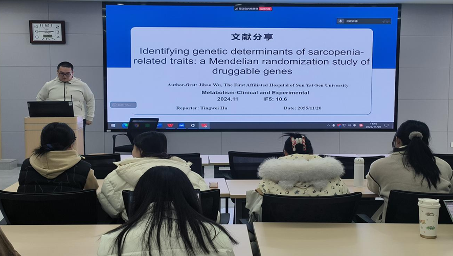 第二位汇报者是2024级硕士研究生胡庭威,分享的文章题目是“Identifying genetic determinants of sarcopenia-related traits: a Mendelian randomization study of druggable genes”。2024年11月发表在Metabolism-Clinical and Experimental期刊,影响因子为10.6分。该研究旨在寻找少肌症的潜在药物靶点,对15944个潜在可成药基因进行了大规模孟德尔随机化分析。通过分析UK Biobank等大型队列的遗传数据,研究发现BORCS7、PM20D1、NUCKS1和UQCC1这四个基因与肌肉质量和功能存在显著的因果关系。其中,BORCS7和UQCC1对肌肉性状有负向影响,而PM20D1和NUCKS1则显示出正向作用。这些因果关系通过了敏感性分析、共定位分析的验证,并在老年小鼠模型中通过体内实验进一步支持,证实了其在衰老肌肉中的表达变化与预测一致。汇报者指出,该研究的亮点在于其系统性地将遗传学证据与药物开发相结合,为治疗少肌症提供了高置信度的新靶点。未来研究需要进一步阐明这些基因的具体作用机制,并在更多样化的人群中进行验证,加速其向临床治疗的转化。