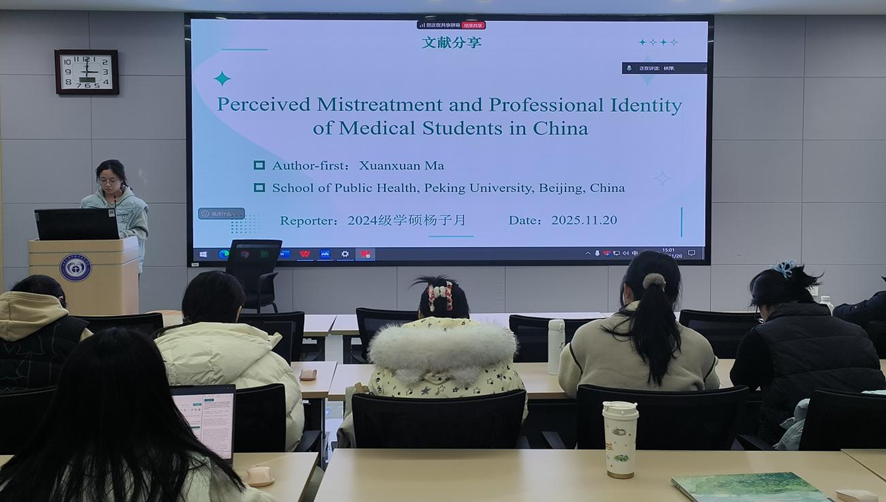 第三位汇报者是2024级硕士研究生杨子月,分享的文章题目是“Perceived Mistreatment and Professional Identity of Medical Students in China”。2024年11月8日发表在JAMA Network Open期刊,影响因子为9.7分。研究调查了全国四个应届医学生队列感知不公平待遇的发生率,并基于该数据分析其与职业认同的关联。研究发现,中国医学生中遭受不公平待遇的情况较为普遍,且医学生所感受到的不公平待遇与其职业认同感之间存在负相关关系以及饱和效应。汇报者指出,研究结果可为更有效地培育医学生的职业认同提供循证依据,未来需要采取有效的策略来营造支持性和尊重性的学习环境。