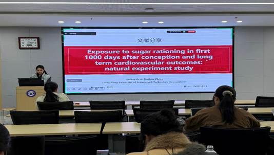 第二位汇报者是2024级硕士研究生孙兵,分享的文章题目是“Exposure to sugar rationing in first 1000 days after conception and long term cardiovascular outcomes: natural experiment study”。2025年10月发表在British Medical Journal期刊,影响因子为42.7分。该研究利用英国二战后糖配给政策,系统探究了生命早期(从孕早期至2岁)限制糖摄入对成年后心血管健康的长期影响。研究发现,在“生命最初1000天”内经历糖配给的个体,其成年后发生心血管疾病、心梗、心衰、房颤、卒中及相关死亡的风险显著降低,且接触配给时间越长,保护作用越明显。进一步的中介分析发现,糖尿病与高血压共同解释了约31%的保护效应,而出生体重的影响则十分有限。此外,心脏磁共振结果提示,早期糖限制与成年后左心室射血分数的轻微改善相关,提示心脏结构或功能可能因此获益。汇报者指出,该研究为“生命早期营养规划”提供了强有力证据,尤其凸显了早期控糖对心血管系统的长远保护价值。这不仅在科学上验证了“胎源假说”在心血管领域的适用性,也从公共政策层面表明,类似糖配给这样的结构性干预,能在群体层面产生跨越代际的健康收益。