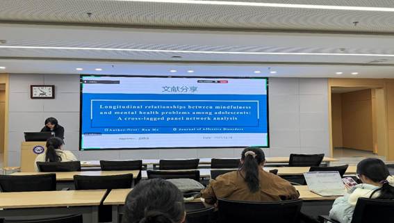 第三位汇报者是2024级硕士研究生孙晓菲,分享的文章题目是“Longitudinal relationships between mindfulness and mental health problems among adolescents: A cross-lagged panel network analysis”。将于2026年2月发表在Journal of Affective Disorders期刊,影响因子为4.9分。该研究以1158名中国西部高中生为研究对象,通过为期6个月的三次追踪调查,深入探讨了青少年正念与心理健康问题之间的纵向双向关系。研究采用交叉滞后面板网络方法,并结合抑郁-焦虑-压力简表与儿童青少年正念量表进行测量。结果发现,追踪期间,青少年的抑郁、焦虑和压力整体呈上升趋势,而正念水平则呈现先升后降的变化。其中,“觉知与不评判”这一正念维度与抑郁、焦虑、压力均存在稳定的负相关关系。在心理症状网络中,焦虑处于核心节点位置,不仅稳定性强,且能预测后续抑郁和压力水平的加剧。研究进一步揭示了正念的两个维度——“觉知与不评判”与“接纳”——之间存在动态协同效应:前期,“觉知与不评判”能够促进“接纳”能力的发展;后期,两者形成互惠强化的良性循环。此外,新冠疫情防控措施的收紧,可能削弱了正念对心理健康的保护作用。汇报者指出,优先识别和干预焦虑,可能是缓解青少年整体心理问题的高效策略;同时,正念干预宜分阶段实施:初期应着重培养“觉知与非评判”的态度,为中后期“接纳”能力的发展及正念技能的循环强化奠定基础。