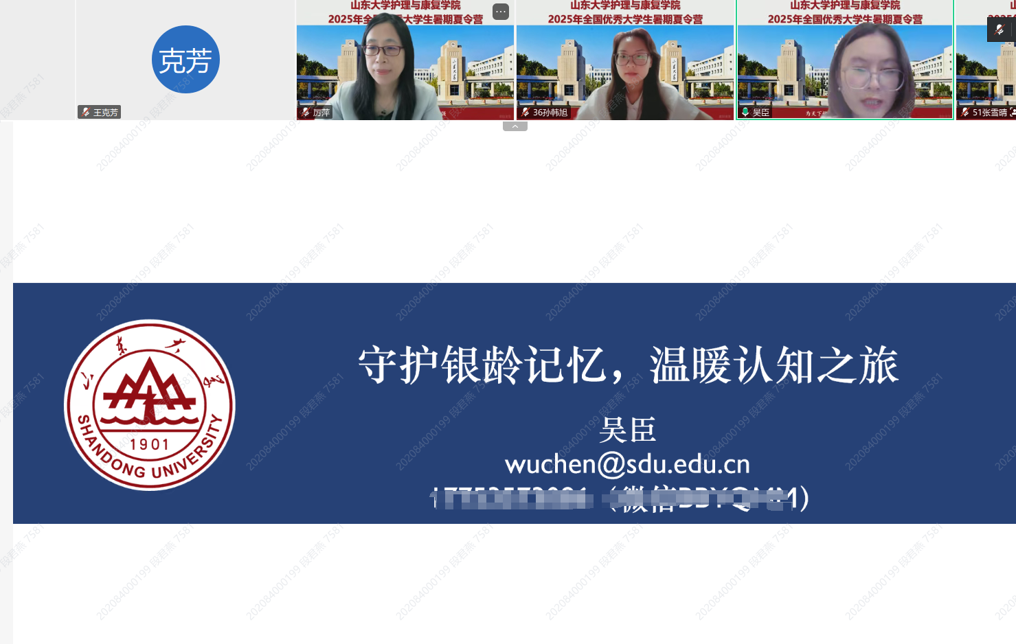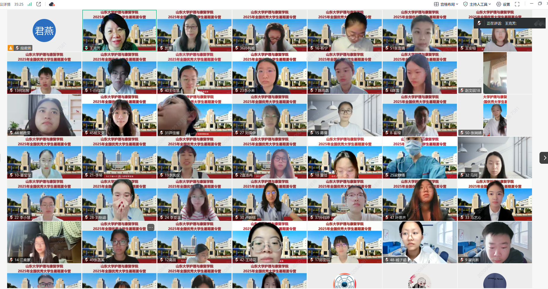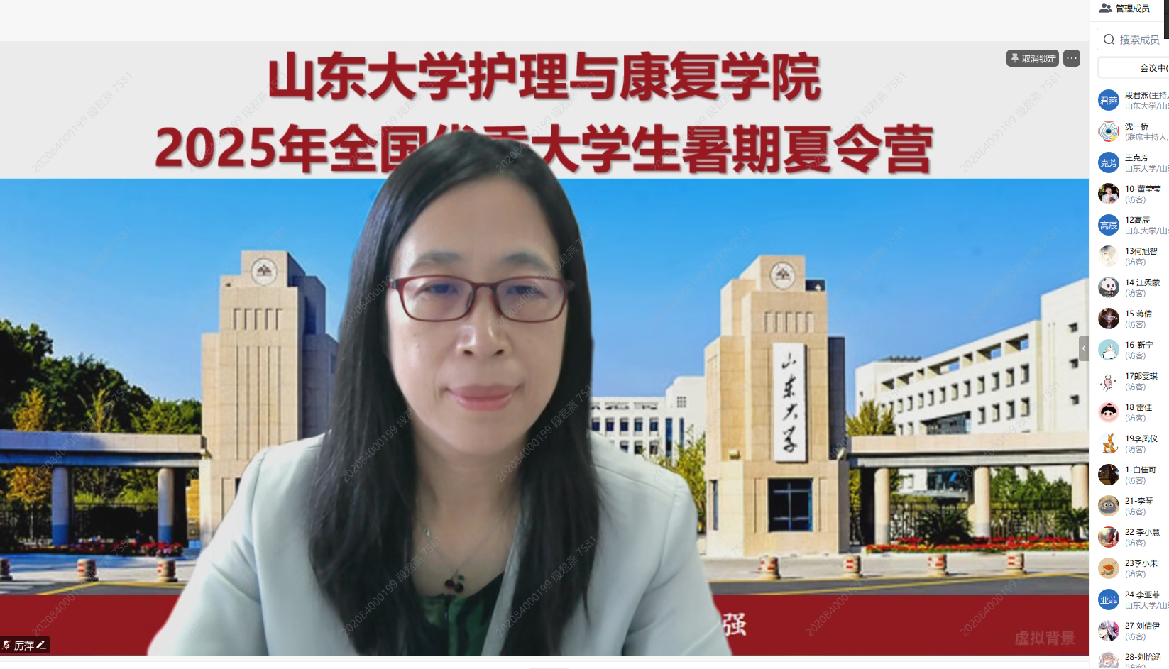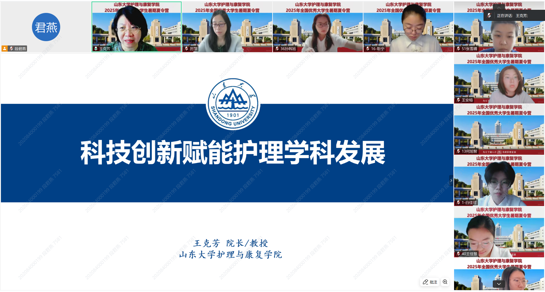 7月18日,护理与康复学院2025年全国优秀大学生暑期夏令营以线上形式成功举办。活动吸引了全国59所高校的243名优秀学子报名,经过严格筛选,最终50名优秀本科生脱颖而出,获得参营资格。护理与康复学院院长王克芳出席开营仪式并致辞,副院长厉萍主持活动。
