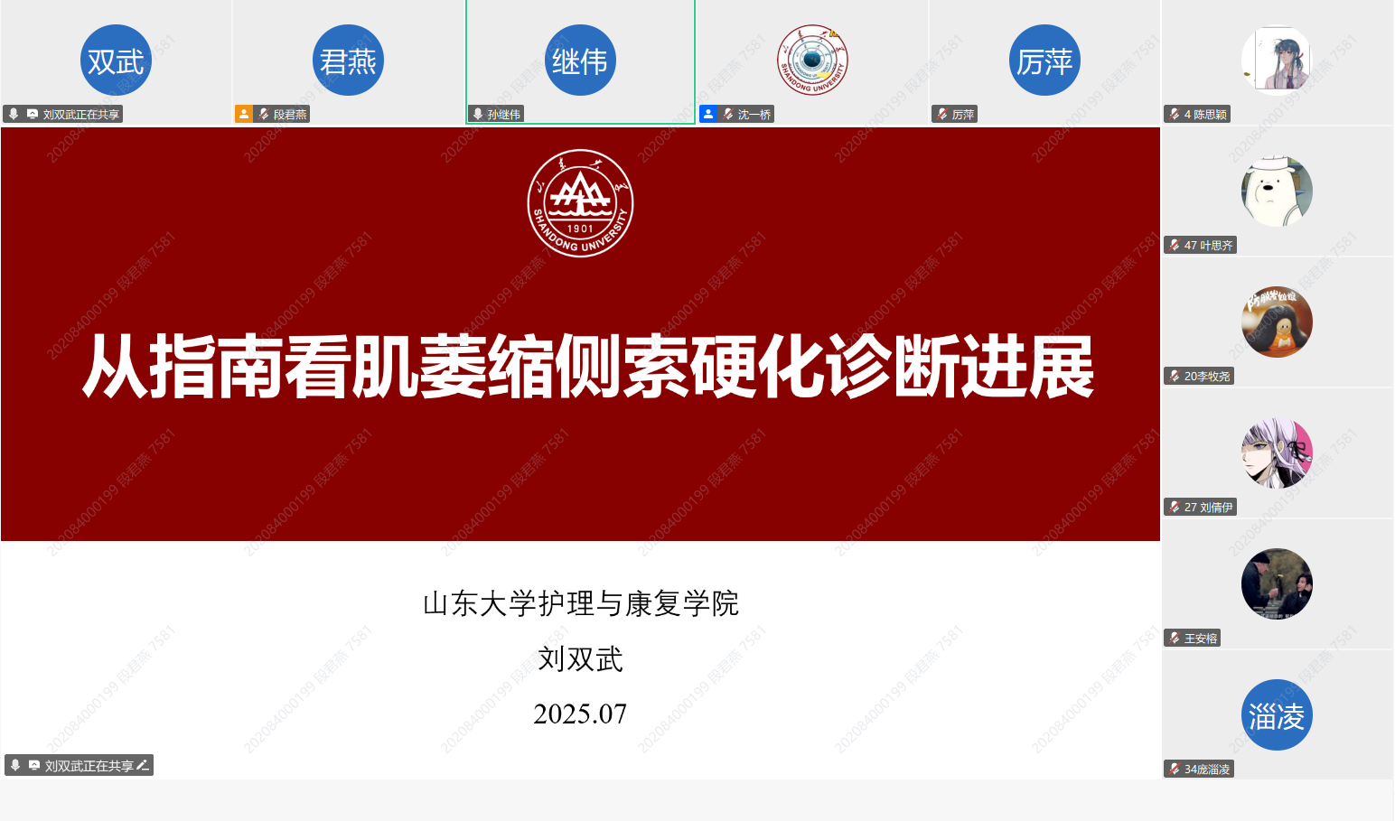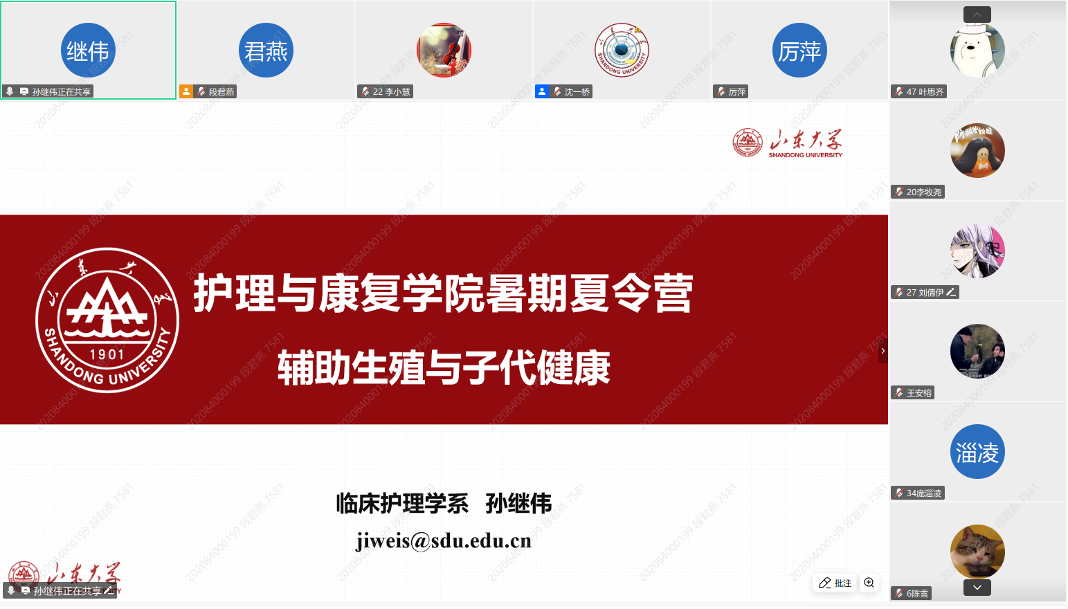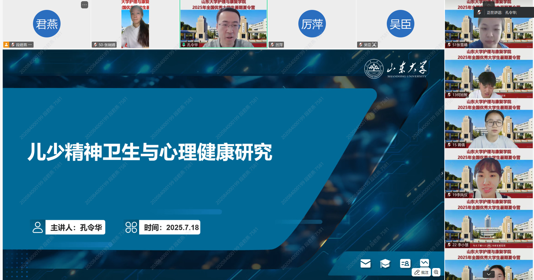 随后,学院四位专家学者围绕护理学不同领域,分别介绍了所在学系的科研方向及团队特色,并分享了最新研究成果。基础护理学系吴臣以“守护银龄记忆,温暖认知之旅”为题,分享了老年护理领域的最新研究成果;人文护理学系孔令华通过大数据分析,深入探讨了“儿少精神卫生与心理健康研究”的前沿进展;临床护理学系孙继伟则围绕“辅助生殖与子代健康”,系统阐述了辅助生殖技术对子代健康的影响机制;康复学系刘双武结合临床实践,详细解读了“肌萎缩侧索硬化诊断进展”。精彩报告既拓展了学术视野,更点燃了研究热情。整场报告展现了护理学多领域的前沿成果与学科特色,为营员们带来深刻学术启迪。