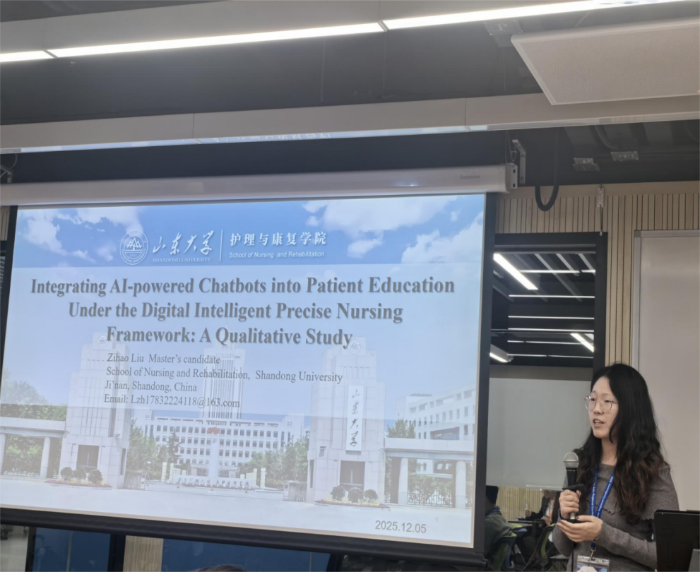 刘子豪在专题分论坛中作了题为《Integrating AI-powered Chatbots into Patient Education Under the Digital Intelligent Precise Nursing Framework: A Qualitative Study》的英文报告,探讨了目前将AI驱动的聊天机器人融入患者教育中的挑战,并提出了未来的优化方向等内容,展示了青年学子在护理与人工智能交叉领域的科研潜力。