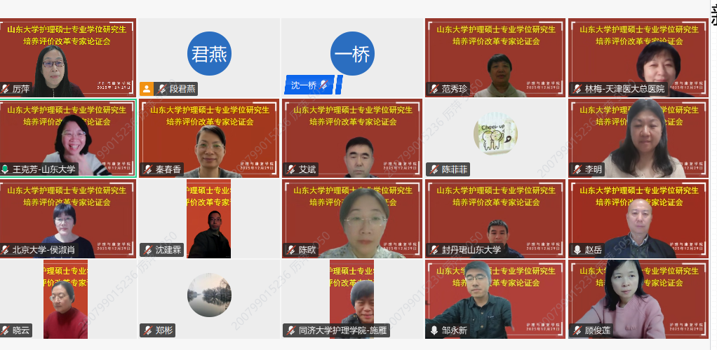为贯彻落实国家关于专业学位研究生教育分类发展的改革精神,创新护理人才培养评价机制,12月29日晚,山东大学护理与康复学院在线组织召开了护理硕士专业学位研究生培养评价改革专家论证会,专题审议《山东大学护理硕士专业学位研究生学位论文及申请学位实践成果实施细则(试行)》。会议由护理与康复学院院长王克芳主持。山东大学研究生院专业学位教育办公室主任、国家卓越工程师学院副院长郑彬,齐鲁医学院教学管理办公室主任邹永新出席会议。护理与康复学院党政领导、学科评议组成员、行业导师代表等共同参会。