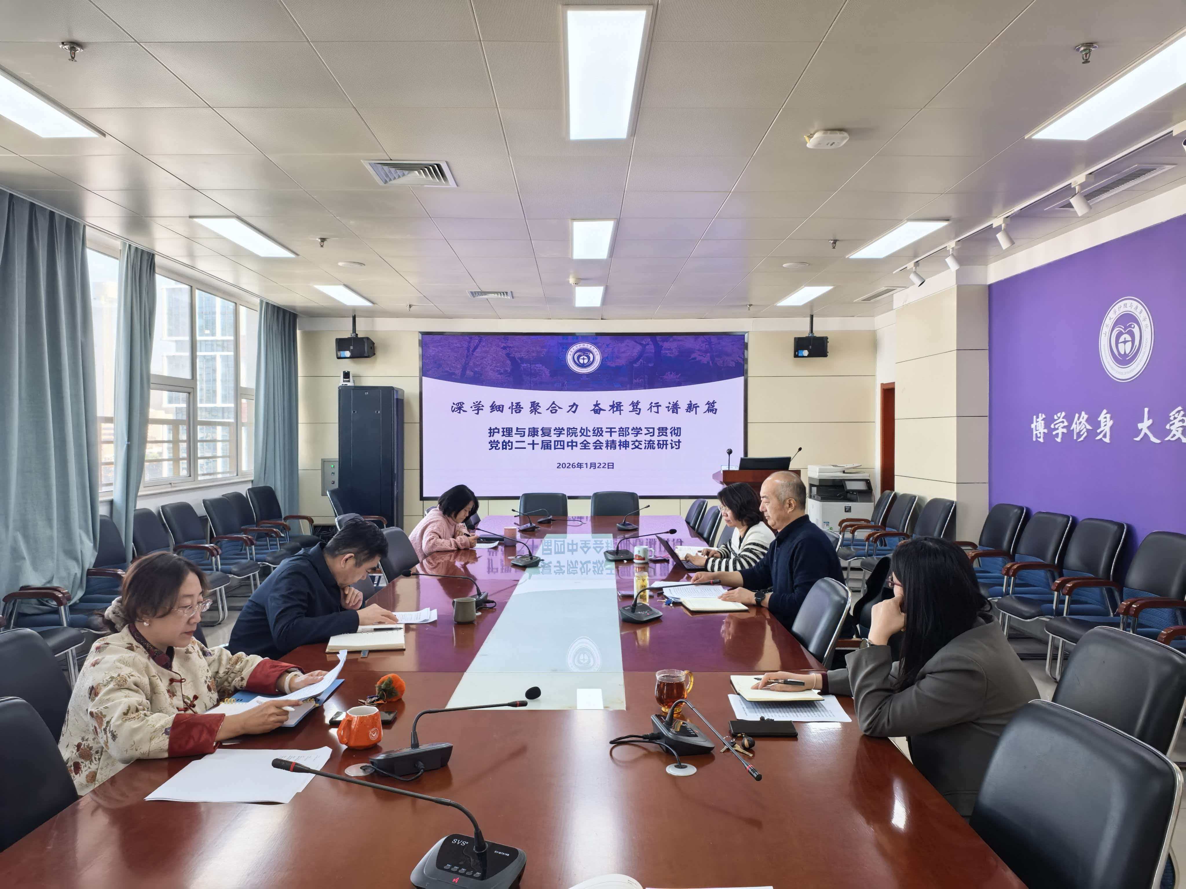 为深入学习贯彻党的二十届四中全会精神,扎实推进“十四五”收官总结与“十五五”规划谋划工作,1月22日,护理与康复学院党委组织处级领导干部开展党的二十届四中全会精神学习交流研讨。学院党委书记王晓林主持会议,领导班子成员参加会议。
