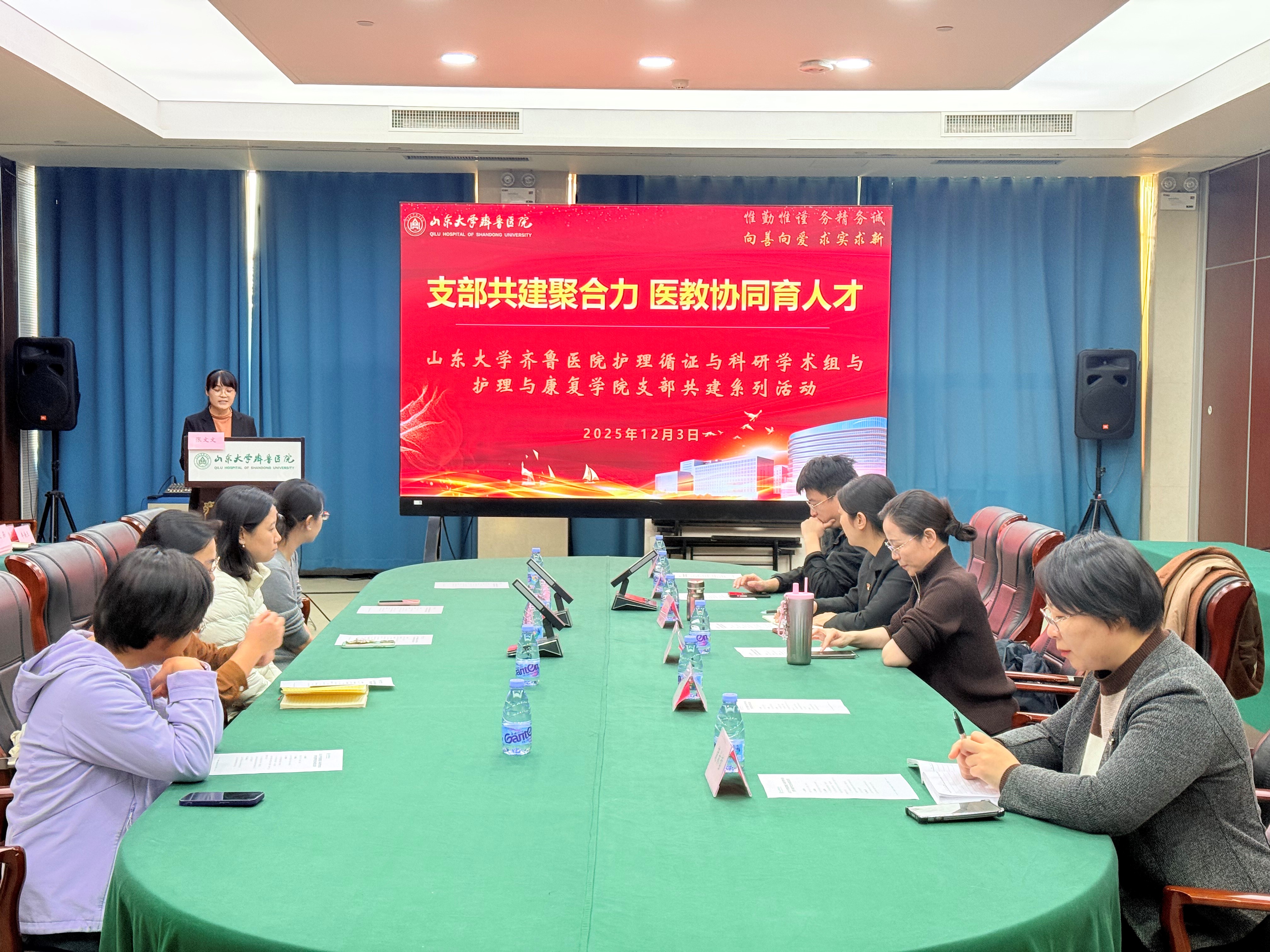 12月3日下午,山东大学护理与康复学院第三党支部与齐鲁医院循证与科研护理学术组在齐鲁医院学术交流中心海棠南厅成功举办支部共建学术交流活动。本次活动以“支部共建聚合力,医教协同育人才”为主题,旨在通过院校合作搭建教学与科研交流平台,推动护理专业的融合发展。护理与康复学院及齐鲁医院多个科室的党员、教师和学生代表共同参与了此次交流。