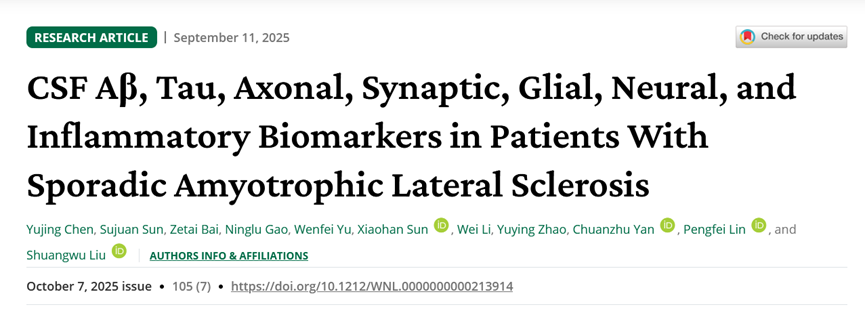 近日,山东大学护理与康复学院刘双武副研究员团队在国际知名期刊《Neurology》(中科院一区TOP期刊,五年IF 9.1)发表题为 《CSF Aβ, tau, axonal, synaptic, glial, neural, and inflammatory biomarkers in patients with sporadic amyotrophic lateral sclerosis》(PMID: 40934454)的研究,该研究探索了ALS患者脑脊液蛋白的改变模式,并揭示了ALS新型脑脊液诊断生物标志物组合。