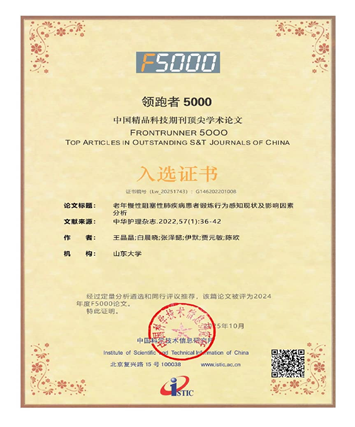 近日,国家科技部中国科学技术信息研究所正式发布2025年度“领跑者5000——中国精品科技期刊顶尖学术论文(F5000)”榜单。山东大学护理与康复学院陈欧教授团队(研究人员王晶晶、白晨晓、张泽懿、伊默、贾元敏、陈欧)发表于《中华护理杂志》2022年第1期的学术论文《老年慢性阻塞性肺疾病患者锻炼行为感知现状及影响因素分析》成功入选。